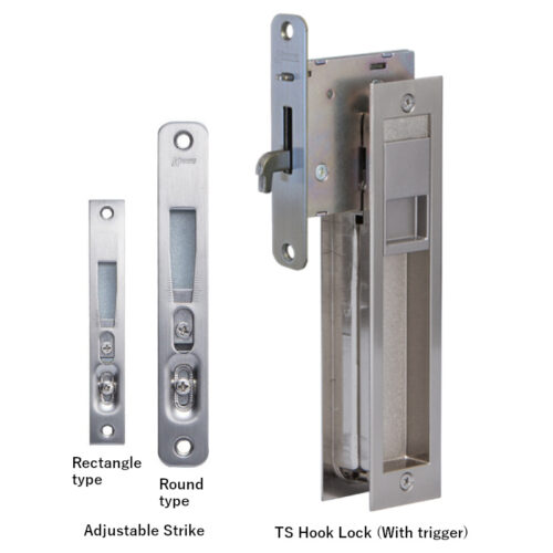 TS Hook Lock is a well-design product winning the Good Design Award. It combines a hook lock and a puller in one unit to be attached to an indoor sliding door. The lock-unlock operation can be done easily by sliding the knob up and down (see fig. Detailed photo 1). It has a streamlined design and a vast surface with some textured parts to highlight a modern minimalist style. On cylinder type, a dimple key with 100 combinations is used to ensure safety. The strike plate is available with or without a trigger. and there are 6 different colors to complement any sliding door color.