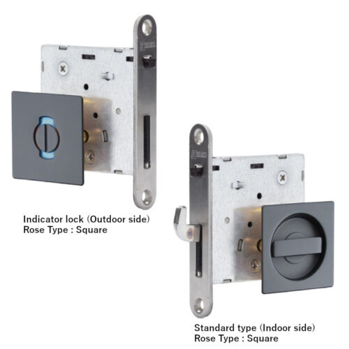 The lock is available in 4 different functions. The escutcheon is available in round and square types. The thumb turn is available in standard thumb turn type, standard lever type, and UD lever type. Available in 6 different colors to guarantee a perfect harmony with the different series of sliding doors.