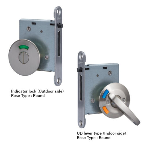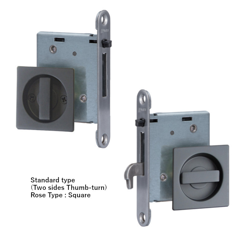 The lock is available in 4 different functions. The escutcheon is available in round and square types. The thumb turn is available in standard thumb turn type, standard lever type, and UD lever type. Available in 6 different colors to guarantee a perfect harmony with the different series of sliding doors.