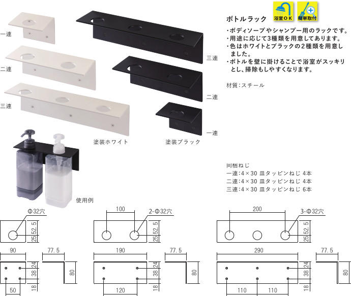 ホワイトとブラックの2色展開でボトルをかけることにより浴室内がすっきりとします。